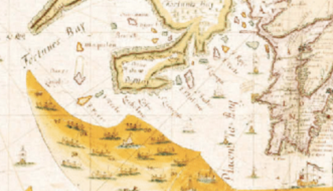 Notes de l’auteur : Carte documentée et répertoriée dans cet article : Toponymie ancienne et origine des noms Saint-Pierre, Miquelon et Langlade. In Le Marin du Nord, vol. VII. No 1. pp. 29-45.